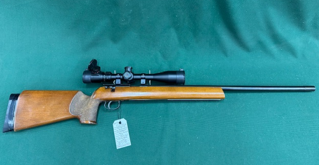 22 ANSCHUTZ MODEL ''64'' TARGET HEAVY 25'' BARREL SINGLE SHOT BLUED WOOD WITH 6-24X40 BARSKA SCOPE – NO BOLT !!!