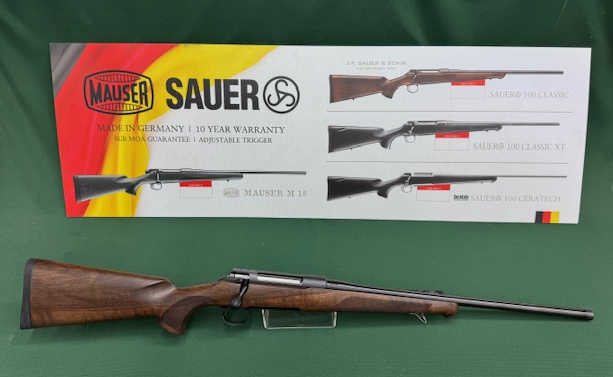 S100308 .308 SAUER 100 CLASSIC BLUED WALNUT 22" 5RD MAG SAUER 100 CLASSIC .308 SAUER 100 CLASSIC BLUED WOOD WITH 5 RD MAG With the S 100 SAUER raises the standard for entry-level rifles. The compelling features of the S 100 include an adjustable single-stage trigger, three-position safety, hammer-forged original SAUER barrel, a famously smooth SAUER bolt, and ERGO MAX stock with the geometry taken from the premium SAUER S 101 and S 404 models. The SAUER 100 sets a new standard for rifles in its class. PREMIUM COMES STANDARD • Classic model with dark-stained beechwood stock • Neutral cast for both left- and right-handed shooters • Cold hammer-forged original SAUER barrel • Three-position safety • Three-lug bolt head • 60-degree bolt lift • EVER REST action bedding • Trigger adjustable from 2.2 to 4.2 lbs • Double-stack magazine • 5+1 round capacity in standard calibers • 4+1 round capacity in mini and magnum calibers • Suitable for all Remington 700 scope bases. We recommend the SAUER Hexalock mount. SHORT ACTION .223 Rem MEDIUM ACTION .243 Win .270 Win .308 Win .30-06 6.5 Creedmoor 6.5×55 8x57IS 9.3×62 7mm-08 MAGNUM ACTION 7 mm Rem. Mag .300 Win. Mag 6.5 PRC