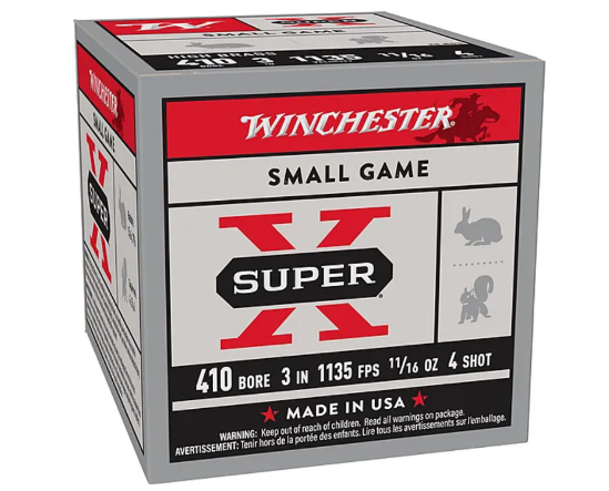AMMO WIN 410G SUPER X 3 (4) Calibre 410G Shell Length 3″ Muzzle Velocity 1135fps Weight 19gm Bullet Type Lead Shot Shot Size 4 Rounds Per Box 25 Rounds Per Case 250