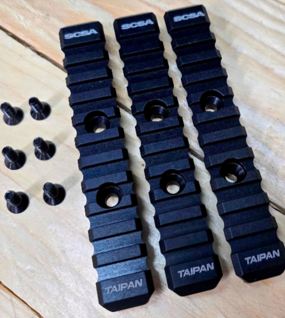 Upgrade your Taipan series rifles with this set of three premium Picatinny rails. Crafted from durable 6061 T6 aluminium and hard anodized for maximum strength, these rails replace the OEM plastic grips, providing a robust and reliable foundation for attaching vertical and angled grips. Enhance your firearm's versatility and performance with these high-quality Picatinny rails. Manufactured by SCSA in Sydney, Australia.