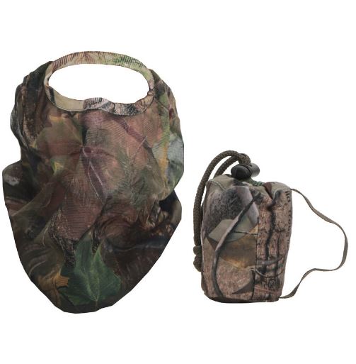 RIDGELINE FACE VEIL NATURE GREEN CAMO COMPLETE IN ITS OWN CAMO POUCH.