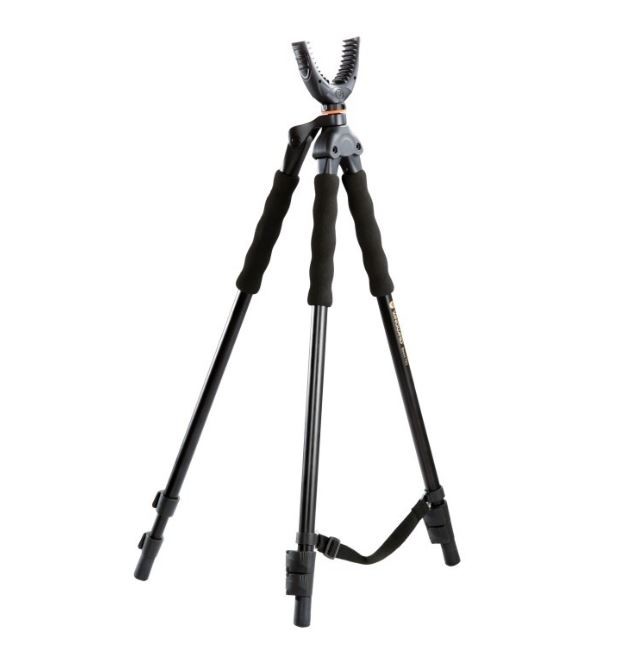 The gun itself rests on a removable U-shaped yoke with rubber fins, providing a secure base for your rifle. The U-shaped yoke swivels 360 degrees so you can make shots at every angle without re-positioning the shooting stick. Remove the U-shaped yoke and it’s universal 1/4″ thread bolt be used with spotting scopes, camcorders or cameras